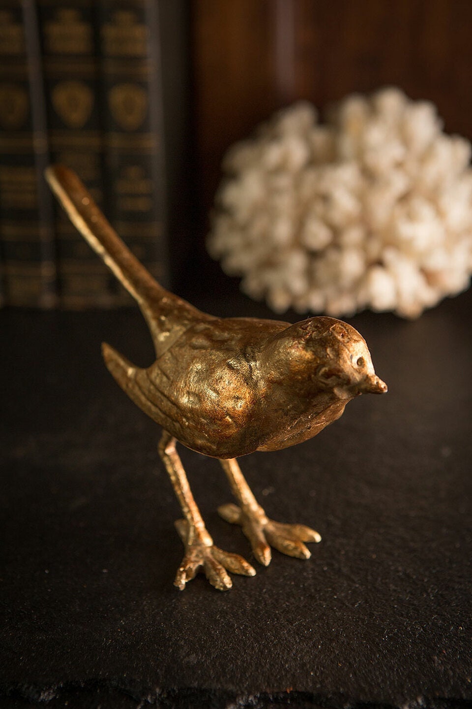 Standing cast iron bird sculpture with a gold leaf finish.
