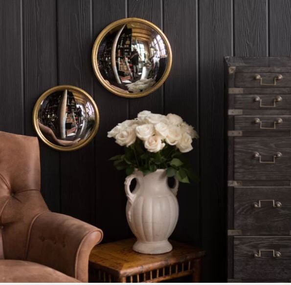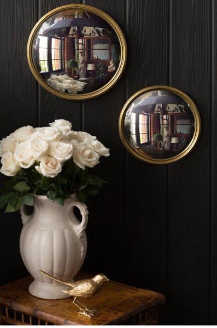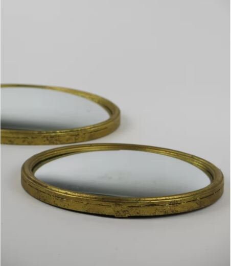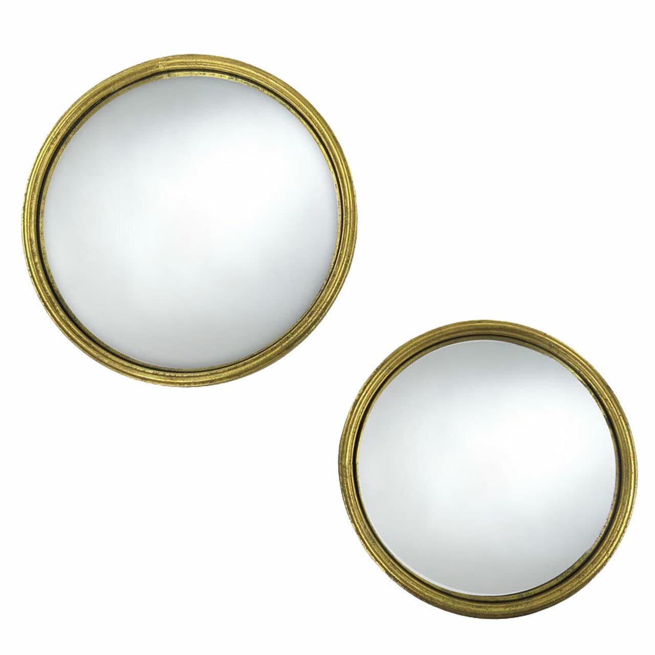These gold leafed metal framed bullseye mirrors are one of our favorites. The glass mirror and antiqued gold leaf are a classic that pairs beautifully with the convex glass mirror.